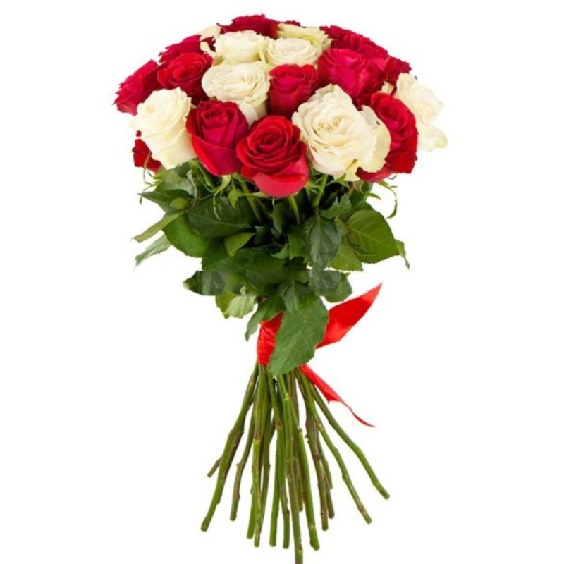 Букет состоит из 10 красных роз, 9 белых роз, прозрачная упаковка, атласная лента.
