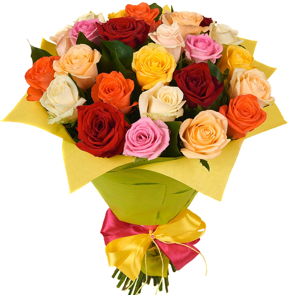 Букет состоит из MIX из 31 розовой / кремовой / желтой / красной и оранжевой розы, красивая упаковка, лента.