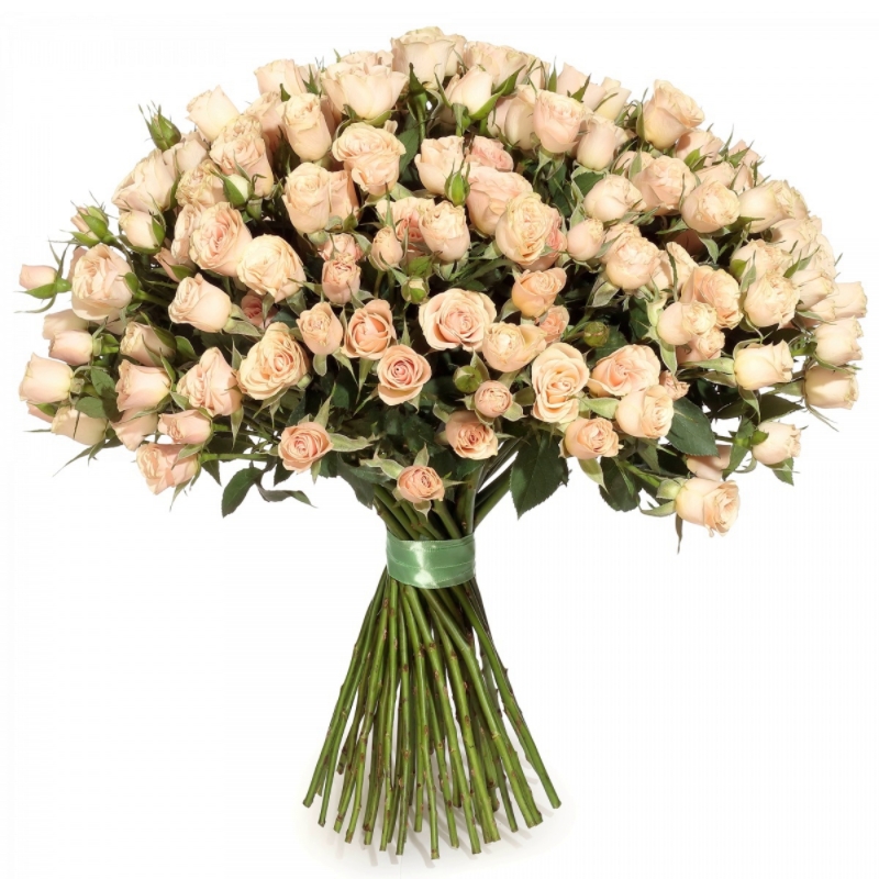 Букет состоит из 45 кремовых кустовых роз, прозрачная упаковка, атласная лента.