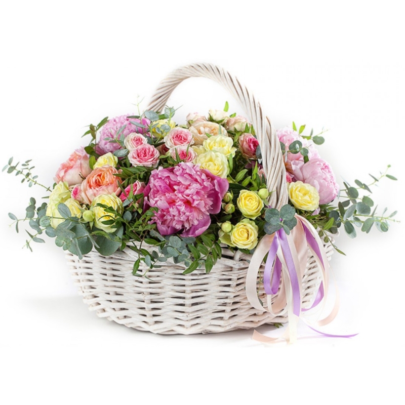 Букет состоит из 5 пионов, 5 пионовидных роз, 9 веток кустовых роз, зелень, корзина, оазис.