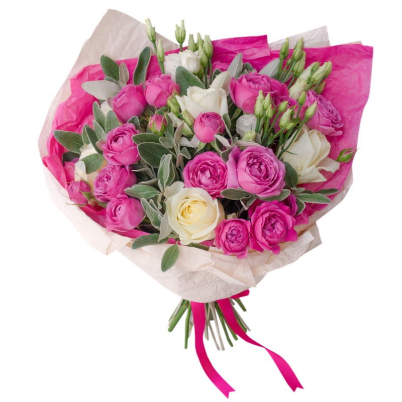 Букет состоит из 5 белых роз, 3 кустовые пионовидные розы, 3 ветки эустомы, зелень, крафт, атласная лента.