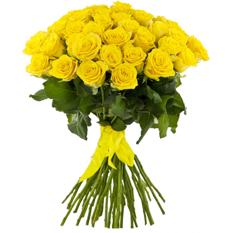 Букет состоит из 31 желтая роза, прозрачная упаковка, атласная лента.